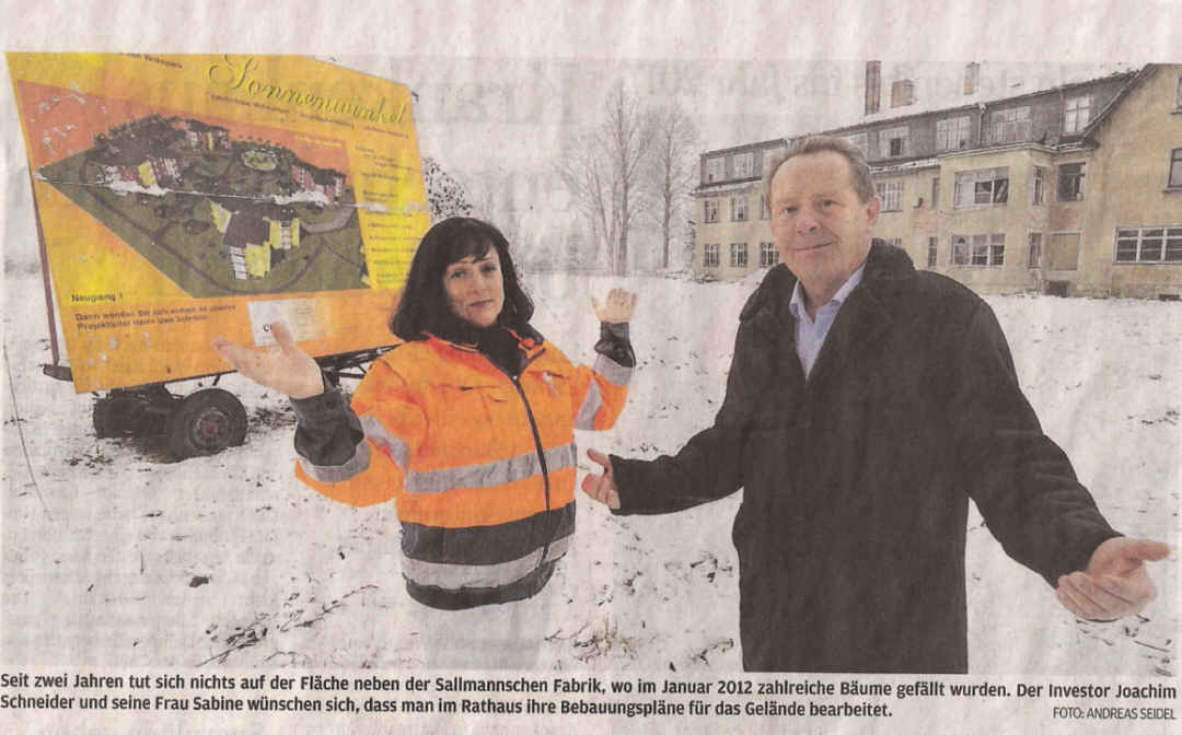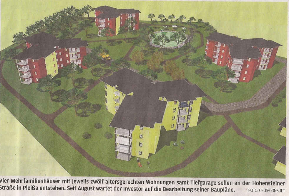 Senioren-Wohnungen: Investor wirft Stadt Verzögerung vor Für die Baumfällungen an der Hohensteiner Straße hat Joachim Schneider Strafe gezahlt. Nun will er bauen. Sein Antrag liegt im Rathaus - und wird nicht bearbeitet. - VON CHRISTIAN MATTHEA _ PLEIßA - Der Kahlschlag der 1,2 Hektar großen Waldfläche neben der ehemaligen Fabrik Sallmann an der Hohensteiner Straße ist seit zwei Jahren Geschichte -getan hat sich seitdem dort nichts. Die verwahrlosten Fabrikruinen stehen immer noch. Die Verfahren gegen Auftraggeber und ausführende Firma sind eingestellt - gegen Zahlung von Geldstrafen. Investor Joachim Schneider zahlte 2500 Euro. Der Vorwurf der Staatsanwaltschaft: Er habe Bäume fällen lassen, auf denen Nester seltener Vögel und Bruthöhlen des Grünspechts gefunden wurden, und eine Waldfläche umgewandelt. Aus Sicht von Schneider handelte es sich um verwilderten Wald, der das letzte Mal in den 1960er-Jahren gepflegt und von vielen Bürgern als Müllkippe genutzt wurde. 140 Tonnen Computerschrott, Farbreste, Eternitschiefer und Lösungsmittel habe er aus dem Gelände geholt. Das Landratsamt Zwickau hatte ihm zwar per Fax mitgeteilt, dass aufgrund der natürlichen Verwitterung im Laufe der Jahre Wald entstanden sei, allerdings sei diese Fläche nicht im sächsischen Waldregister eingetragen gewesen, erklärte er. Ich will mich nicht schuldfrei sprechen, und ich hätte sicherlich stärker recherchieren müssen", so Schneider weiter. Als Investor habe er sich allerdings auf die beauftragte Fachfirma verlassen. Der Baumpflege-Betrieb zahlte unlängst ebenso Geld, womit auch dieses Verfahren eingestellt wurde. Die Strafe fiel mit 5000 Euro allerdings höher aus. Zu den Umständen wollte sich der Geschäftsführer gestern nicht äußern - er habe bereits genug Ärger mit der Angelegenheit gehabt, sagte er. Schneider will seinen Fehler wieder gutmachen und die abgeholzten 1,2 Hektar in unmittelbarer Nähe wieder aufforsten. Bislang habe er 250.000 Euro in sein Projekt investiert. Er kaufte das Grundstück 2010 und musste davor 48 Erben der ehemaligen Inhaber der Sallmannchen Fabrik aufsuchen,.bis der Kaufvertrag zu Stande kam. Selbst in Vancouver und New York musste unser Anwalt recherchieren", sagte der Limbacher. Sein Architekt hat die Entwürfe für die vier Häuserkomplexe mit 48 altersgerechten Wohnungen entwickelt. Der sogenannte vorhabenbezogene Bebauungsplan liegt nun seit September 2013 im Rathaus Limbach-Oberfrohna. Doch dort passiert momentan nichts. Oberbürgermeister Hans-Christian Rickauer erklärt das mit der Lage des geplanten Baugebietes am Rande der Stadt. Es gebe eine klare Aussage der Landesdirektion als Raumordnungsbehörde, dass für weitere Baugenehmigungen im Außenbereich andere geplante Wohnbauflächen zurückgenommen werden müssten und dass die Stadt einen Flächennutzungsplan (FNP) aufstellen solle, um die Prioritäten für die zukünftige Stadtentwicklung festzulegen. Daran arbeite die Verwaltung, so Rickauer. Beispielsweise werde deshalb das Baugebiet Am Querweg verkleinert. Das Landratsamt als Genehmigungsbehörde wiederum sei allerdings übergangsweise bereit, so der OB weiter, die bereits eingereichten Pläne zu bearbeiten - dazu zählen Flächen an der Anton-Günther-Straße und an der Wiesenstraße. Die Bearbeitung der später eingereichten Pläne von Joachim Schneider sei dagegen nur im Rahmen eines FNP möglich, so der OB. Mit der Fertigstellung dieses Papiers rechne er nicht vor 2016. Auf die Frage, wie die Stadtverwaltung die Pläne von Joachim Schneider generell einschätzt, antwortete der OB: Einerseits gebe es aufgrund der demografischen Entwicklung Bedarf für altersgerechtes Wohnen in der Stadt. Andererseits müsse man auch die Vorhaben anderer Träger wie des DRK und der Bonavita für die künftige Stadtentwicklung betrachten. Für Investor Schneider ist der genannte Zeitraum bis 2016 viel zu lang. Derzeit bereitet er ein Schreiben an die Stadträte vor, in dem er sie von seinem Projekt überzeugen will. Mit dem Abriss der Ruinen, der weitere 180.000 Euro kosten würde, will er warten. Abreißen lassen und dann nicht bauen dürfen, soviel Geld habe ich nicht", sagte er. Quelle: Freie Presse" vom 29.01.2014 |