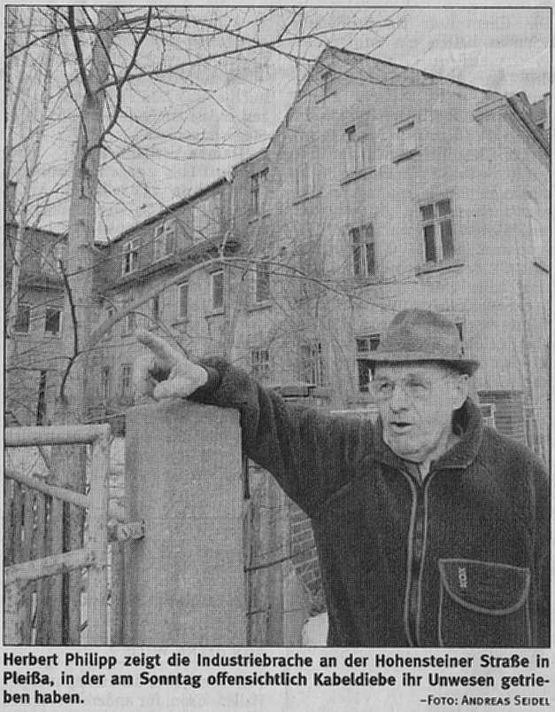Kabel-Diebe legen Stromversorgung lahm Nachbarn der früheren Textilfabrik in Pleißa ohne Strom Pleißa. Ohne Strom waren am Sonntagmittag die Bewohner eines Hauses an der Hohensteiner Straße in Pleißa. Offensichtlich hatte zu dieser Zeit einer oder mehrere unbekannte Täter versucht, Stromkabel aus der benachbarten Industriebrache zu stehlen. Wir waren gerade mit Mittagessen fertig, als der Strom ausfiel. Da in Nachbarhäusern der Strom weiterhin da war, ist mein Enkel gleich zu der Brache gelaufen, um nach dem Rechten zu sehen", berichtete gestern Herbert Philipp. Denn das Wohnhaus bezieht seinen Strom über die Elektroanlage des früheren Textilbetriebes (ehemals Firma Sallmann, später VEB Feinwäsche "Bruno Freitag" / Werk 4.4 d. Red.). Die Sicherungen waren herausgezogen worden. Wir nehmen an, dass der oder die Täter sich dabei die Augen verblitzt haben und deshalb vor Schreck ausgerissen sind", vermutet der Rentner. Zurück blieb lediglich ein Rucksack mit Kabelstücken und Werkzeug. Das stamme laut Philipp aus den 1970ziger Jahren, was seiner Meinung nach darauf schließen lasse, dass es sich um ältere Täter handelt. Der Energieversorger Envia wurde durch die Polizei vom Stromausfall informiert. Beim Kabelklau hat es wahrscheinlich einen Kurzschluss gegeben", sagte gestern Uwe Kramer, bei Envia Leiter Netze Südsachsen. In der Trafostation sei der Schaden behoben worden. Von 13.40 bis 15 Uhr war die Stromleitung unterbrochen", meinte Kramer. Angaben zur Schadenshöhe liegen noch nicht vor", sagte Polizeisprecherin Heidi Hennig. Herbert Philipp wohnt seit 2002 in dem Haus. Die benachbarte Brache gehört nach seinen Angaben einer Erbengemeinschaft. Ich kümmere mich um Ordnung rund um dieses Grundstück", erzählt der Pleißaer. Das sei allerdings eine Sisyphus-Arbeit, berichtet er von zahlreichen Einbrücken in die Brache. Das gehe fast schon wie am laufenden Band, erzählt er und erinnert an das Kupferdach eines Vorbaus, das auch schon gestohlen wurde. Die Heizkörper einschließlich der Verbindungsrohre seien ebenfalls ausgebaut und abtransportiert worden. Von den vielen Schlössern, die er bereits eingebaut habe, ließen sich Täter nicht abschrecken. Man kann eine Tür zunageln und die Leute kommen und öffnen sie mit einem Stemmeisen. Da kann man schon verzweifeln", sagt er. Auch aus anderen Gründen sorgt sich Herbert Philipp: In der Brache habe es bereits fünfmal gebrannt, rechnet er nach. Zwei dieser Brände bezeichnet der Pleißaer als ganz schön heftig". (BJ/SO) Quelle : Freie Presse" vom 27.01.2009 |