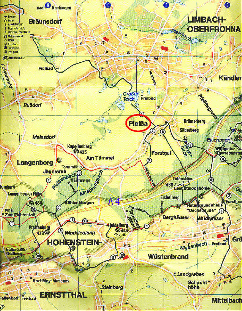 Pleißa mit einer Einwohnerzahl von 2000 Einwohnern reiht sich als Waldhufendorf entlang dem nach Nordosten abfließenden Pleißenbach auf. Stellenweise ist das Gewässer tief eingeschnitten, sein rechter Hang steigt steil gegen den Rabensteiner Wald an. Im Süden wird der Ort durch den Rabensteiner Wald begrenzt, der für den Naturhaushalt sehr wertvoll ist. Eine natürliche Grenze bildet das Limbacher Teichgebiet im Norden. Diese Gebiete sind vor allem für die Erholung der Bürger von großer Bedeutung. Ein weiteres Landschaftsprägendes und gliederndes Element stellen die Gräben und Bäche mit ihren Tälern und Niederungen dar. Der Ort mit seiner Größe von 7,2 qkm erstreckt sich über eine Höhenlage zwischen 371 m üNN und 451 üNN. ( >Übersichtskarte< ) Pleißa wurde zur gleichen Zeit wie die umliegenden Ortschaften gegen Ende des 12. Jahrhunderts gegründet. Bis 1375 gehörte der Ort zur reichsunmittelbaren Herrschaft Rabensteins. Die ersten sicheren Erwähnungen von Pleißa finden wir in einer Urkunde vom 13. Dezember 1375 unter dem Namen Steinplißen. Wahrscheinlich haben die ersten deutschen Ansiedler den slawischen Bachnamen Pleiße auf ihre Neugründung übertragen. Der Name Pleißenbach selbst wird schon 1402 als "daz waßer dy Plyßen" überliefert. Im Verband der Herrschaft Rabenstein war Pleißa 1375 aus dem Besitz der Herren von Waldenburg an das Benediktinerkloster Chemnitz übergegangen. Mit der Einführung der Reformation endete diese Abhängigkeit. Die niedere Gerichtsbarkeit oblag dem Pleißaer Lehnrichter, dessen Besitz mit der Jagdgerechtigkeit verbunden war. Die Fluren des Lehnrichtergutes reichten in den "Fichtenbüschen" bis an den Eichelberg und bis an den Tümmel. Nach der Einführung der Reformation wurde Pleißa kurfürstliches Amtsdorf des Amtes Chemnitz. Nach einem Brand von 1731 wurde die Kirche neu errichtet und im Jahre 1740 geweiht. Von der barocken Innenausstattung ist der Altar leider nicht mehr erhalten. Der Taufstein zeigt Empireformen. Charakteristisch für die Kirche in Pleißa ist der seit 1990 rekonstruierte barocke Innenraum mit einem zeitgenössischen Altarbild. Die Kirche und das Rathaus stehen heute unter Denkmalschutz. In der Ortsmitte befinden sich außer der Kirche und der Schule das Rathaus, das in den Jahren 1925/26 als typischer Bürgerbau errichtet wurde.Zum ersten Mal ist im Jahre 1645 als Berufsbezeichnung die eines "Leinewebers" eingetragen, jedoch ging die Leineweberei zu Gunsten der Strumpfwirkerei bald zurück. . Der vorwiegenden Erwerbszweige waren bis zur Wende die Landwirtschaft, die Trikotagenindustrie und der Textilmaschinenbau. Die Wende im Jahre 1989 hat für die Gemeinde völlig neue Perspektiven und vollständig neue Anforderungen gebracht. Vor den Toren von Chemnitz wurde 1993 der Industriepark Pleißa-West seiner Bestimmung übergeben. Dabei wurden allein rund 17 Mio. Mark in die Erschließung des Geländes investiert. Auf diesem Gelände von 22 ha haben sich inzwischen 22 Firmen angesiedelt. Ausschlaggebend bei der Standortwahl war die verkehrsstrategisch günstige Lage durch die Autobahnanbindung Gera - Dresden E 40. Der Erfolg vom Industriepark Pleißa-West soll jetzt wenige Kilometer östlich davon mit einem 2. Gewerbegebiet von 35 ha Fläche wiederholt werden.Aber nicht nur im Gewerbegebiet haben viele Pleißaer Bürger Arbeit gefunden, sondern sie sind auch u. a. in Handwerksbetrieben, in der Land- und Forstwirtschaft, im Handel, in der Gastronomie sowie im Dienstleistungsgewerbe tätig. Die relativ kleine Gemeinde Pleißa bietet jedoch nicht nur die Möglichkeit zum Arbeiten vor Ort,sie kann auch als attraktiver Ort zum großzügigen Bauen und Wohnen angesehen werden. Außer vielen Einzelstandorten soll in den kommenden Jahren ein Wohngebiet errichtet werden. Praktisch direkt vor den Toren der kreisfreien Stadt Chemnitz und der großen Kreisstadt Limbach-Oberfrohna bietet Pleißa eine Oase des dörflichen Lebens. Das nahe gelegene Naherholungsgebiet Oberrabenstein und das Landschaftsschutzgebiet Limbacher Teiche lassen sich bequem durch den zur Zeit entstehenden Rad und Wanderweg erreichen. Auch die in bestimmten Gemeindeteilen vorhandenen Wasser-, Wald- und Wiesenflächen lassen die Nutzung als Naherholungsbereich geradezu ideal erscheinen. Für Gäste und Besucher bietet der Ort die Möglichkeit sich im Hotel und in Pensionen zu erholen. Für das leibliche Wohl sorgen außerdem 3 Gaststätten. | |||||||||||||||||||||||||||||||||||||||||||||||||||||||||||||||||||||||||||||||||||||||||||