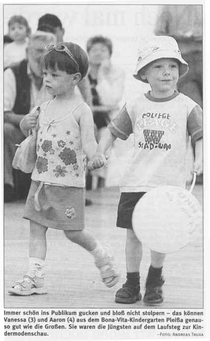 Tolle Stimmung auf Dorffest - Jugendbands spielen auf - Kindergarten und Schule sorgen mit für Unterhaltung Zum Pleißaer Dorffest steppt der Bär Pleißa (UW). Die Pleißaer verstehen es, zünftig zu feiern. Das zeigte das diesjährige Dorffest am Wochenende. Fast der ganze Ort war auf den Beinen, um auf dem Festplatz gemütliche und unterhaltsame Stunden zu erleben. Eingebunden in das Festprogramm waren natürlich auch die Jüngsten des Ortes. So zeigten diese, was sie drauf haben, bei der Mini-Playback-Show. Auch bei einer Modenschau zeigten die Kinder, was sie können. Sie präsentierten die Textilien fast schon wie die großen Models. Videokameras und Fotoapparate der Eltern liefen da fast heiß. Auch im Freien war jede Menge los. Unter anderem war Bierkastenklettern angesagt. Wer sich einmal dafür entschieden hatte, der wurde gesichert und bekam Kasten für Kasten gereicht. Gleichgewicht halten und Geschicklichkeit waren gefordert, um Meter für Meter in die Höhe zu kommen. Und wenn der Stapel doch mal zusammen fiel, dann hing der Kletterer sicher am Seil der Feuerwehrdrehleiter und schwebte sanft zu Boden. In der Turnhalle hatte der Schützenverein sein Domizil aufgeschlagen. Dort konnten sich die Besucher im Armbrustschießen versuchen. Wer gedacht hatte, einfach mal Armbrust spannen, Pfeil einlegen, Ziel anvisieren und auch gleich treffen, der irrte gewaltig. Da war schon eine ruhige Hand gefragt, um den Pfeil in das Ziel zu bringen und auch das Spannen der Armbrust erforderte reichlich Kraft. Am Samstagabend spielten gleich drei Jugendbands aus Pleißa auf. Iguana", Spilled Stout" und Used Illusions" sorgten für ganz jugendliche Klänge. Da ging bei den Besuchern die Post ab. Zum bunten Festtreiben gehörte auch ein Volleyballturnier in der Turnhalle und eine Vorführung des örtlichen Hundesportvereins. Dabei zeigten die Tiere, wie gelehrsam sie sind und was sie bei der Ausbildung schon alles gelernt haben. Musikalisches Highlight des Festes war zweifelsohne das Konzert der Breitenauer Musikanten. Bei ihren volkstümlichen Hits sprang schnell der Stimmungsfunke auf die Besucher über, wurde mitgeklatscht und mitgeschunkelt. Quelle: Blick" vom 30. Juni 2004.07.03 |