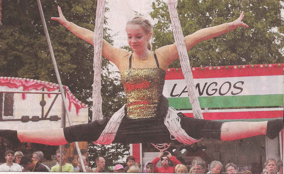 Akrobat - schööön!" in Pleißa Pleißa (ABU). Die Gäste des Pleißaer Dorffestes wurden am Samstag mal eben von Manegenluft umweht: Als die Sportler des Chemnitzer Vereins TAM (Turnen, Artistik und Manege) e.V., ihre akrobatischen Übungen in und vor dem Festzelt präsentierten, blieb so manchem Zuschauer teilweise die Luft weg. Wir haben heute auch unsere Trilopie mit dabei", erklärte Gründungsmitglied Micha Haase und verwies auf die drei aufgebauten Segmente, an denen während des Programms beispielsweise Übungen am Trapez und am Netz gezeigt wurden. Der Kontakt zum Fest war auf privatem Wege zustande gekommen, allerdings war auch eine aktive Pleißaerin mit am Start: Lisa Lindner zeigte mit einer Freundin hoch konzentriert Übungen im Duo, wobei die beiden Mädchen beste Körperbeherrschung und Kraft boten. Aufregung kannte Lisa beim Heimspiel" nicht: Aber es ist schon etwas Besonderes, das wir gerade hier auftreten." Foto: Annett Büchner ; Quelle: Blick" vom 29.06.2011 |