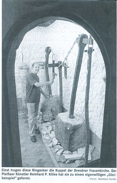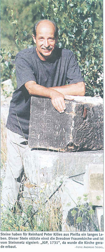 Auf der Spur der Steine Reinhard P. Kilies aus Pleißa begibt sich in die Welt von Elbsandstein und Porphyrtuff von marianne schultz Limbach-Oberfrohna/OT. Pleißa. Wer das Anwesen von Reinhard P. Kilies betritt, weiß eigentlich nicht, wohin er zuerst sehen soll: Alles gibt es hier reichlich, auch Ruhe. Es scheint, als hätte der Tag einen längeren Atem, als würde er sich dem Rhythmus der Natur anpassen. Katzen räkeln sich in der Sonne, der Dompfaff hat sich am Morgen gezeigt - Reinhard P. Kilies hat ihn schon eine Weile nicht gesehen. 60 Vogelarten sind ihm im Laufe der Jahre hier begegnet, auch die seltenen Bergfinken, die auf ihrer Reise von Süden nach Skandinavien hier Station machen. Der einstige Bauernhof wurde von ihm selbst rekonstruiert, ein sich idyllisch ausbreitendes Anwesen auf 6000 Quadratmetern, eins geworden mit dem anmutigen Auf und Ab der umgebenden Hügel, der von eigener Hand geschaffenen Teichlandschaft am Waldrand in Pleißa. Der kecke Entennachwuchs - es sind genau 41 Küken - versteckt sich in der Mittagshitze. Dazu Steine, Steine, Steine. Ganze Wagenladungen großer schwerer Blöcke, von denen jeder ein Stück Geschichte erzählen könnte. Ein Pfad ist gesäumt von Steinen der Dresdner Frauenkirche, die bei der Rekonstruktion keine Verwendung fanden, ausgemustert auf Grund ihrer Beschädigung, die der Steinkünstler" hochoffiziell zur künstlerischen Bearbeitung von der Stiftung Frauenkirche zur Verfügung gestellt bekam. Ein unvorstellbarer Reichtum, der die Phantasie in Gang setzt, Steine, die teils noch die Handschrift der alten Steinmetze tragen. Inschriften von IGP, 1731" sind vermerkt. Das war noch während der Bauzeit. Oder das Stück einer Triumphvase. Viele Quader tragen die Brandzeichen der letzten Nacht, in der die Frauenkirche in Schutt und Asche fiel. Gewaltige Ringanker sind hier zu einem eigenwilligen Glockenspiel" geformt, die einst die Kuppel der Frauenkirche getragen haben. Vor 200 Jahren wurden sie in Schmiedeberg geschmiedet. Reinhard P. Kilies bringt sie mit leichtem Hammerschlag zum Klingen, auf Ausstellungen in der Dresdner Frauenkirche und in der Chemnitzer Jakobikirche hat er damit unglaublichen Erfolg bei den Zuhörern gefunden. Die Steine der Frauenkirche sind das eine. Sie treten stumm in Beziehung zu den vielen Steinen heimischer Abbruchhäuser, gerettet vor dem Vergessen aus dem Schutt, vom Müll, einer neuen Bestimmung entgegen sehend. Elbsandstein und Chemnitzer Porphyrtuff, dazu Glimmerschiefer und vielen, vielen andere Steinarten gehört die große Liebe von Kilies. Ihnen gibt er ein neues Gesicht, eine neue Bestimmung in Skulpturen, in Steinbildern, die die verborgene Schönheit, das reiche Innenleben, die Struktur der Steine sichtbar machen und die ein klares Bekenntnis zum traditionellen Stein der Baumeister vergangener Jahrhunderte ausdrücken. Vier mal viereinhalb Meter wird das Wandbild messen, das Kilies vollkommen aus Stein für die neue Stadthalle Limbach-Oberfrohna als Auftragswerk arbeitet. Die Idee wird den Bürgern noch offiziell vorgestellt werden, deshalb nur so viel: Ausschließlich Steine der Heimat finden hier Verwendung, der rote, gelbe, bläuliche Rochlitzer Stein ebenso wie der Chemnitzer, dessen Farbenspiel von Grün, Weiß, Grau und Lila eine edle Pracht entfaltet. Auch aufgeschnittene Ziegel aus alten Limbacher Häusern kommen so zu Ehren. Reinhard P. Kilies ist bei all dem Spektakulären seiner Unternehmungen noch nicht einmal allzu lange auf dem Steinweg". Der Kunsterzieher und Romanist hat viele Jahre lange als Dolmetscher für Italienisch gearbeitet. Beim Hausbau fand er zum Stein, und irgendwann wollte ich wissen, wie es inwendig aussieht." Quelle: "Freie Presse" vom 21. August 2003 - Es handelt sich um das sog. "Waldhaus-Atelier" - sh. Bild (Anm. d. Red.) |