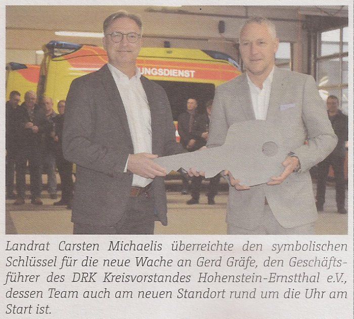365 Tage rund um die Uhr für Notfälle im Einsatz Neue Rettungswache in Pleißa Ende November übergeben Großer Rummel herrschte Ende November als die neue Rettungswache an der Hohensteiner Straße offiziell übergeben wurde. Landrat Garsten Michaelis, der auch Vorsitzender des Rettungszweckverband es Südwestsachsen ist, zeigte sich froh, dass mit dem neuen Gebäude optimale Bedingungen für den Rettungsdienst geschaffen werden konnten. Der alte Standort an der Lindenstraße war nicht mehr zeitgemäß, was sich auch beim Werben um gute Fachkräfte bemerkbar gemacht hat", betonte er. Neben den hervorragenden Arbeitsbedingungen sei auch die Nähe zur A4 ein Vorteil. Nicht ganz ohne Stolz hob er hervor: "Unser Rettungszweckverband kann beste Hilfszeiten vorweisen. Bei 92 Prozent der Einsätze kann die vorgeschriebene Zeit eingehalten werden". Insgesamt verfügt der neue Standort über 1.250 Quadratmeter auf zwei Etagen. Dazu gehören zwei Fahrzeughallen, Sanitär-und Umkleidebereiche, Schulungsraum, Büros sowie Funktions- und Aufenthaltsräume. Für den diensthabenden Notarzt wurde sogar ein kleines Appartement integriert. Mein Dank gilt den Planern und allen am Bau Beteiligten sowie natürlich dem Team, dass den Umzug neben der eigentlichen Einsatztätigkeit so gut gewuppt hat", so der Landrat weiter. Rund 3,5 Millionen Euro investierte der Rettungszweckverband in den neuen Standort, wobei die Finanzierung über die Krankenkassen sichergestellt wurde. Anja Klein, die Leiterin der Rettungswache, konnte mit ihrem Team die neuen Arbeitsbedingungen bereits einige Tag vor der offiziellen Übergabe testen. Denn nach dem Umzug vom alten Standort in die neuen Räume mussten sich alle erst an die neuen Abläufe gewöhnen. Am 25. November sind wir mit allen Sachen umgezogen und mit der Nachtschicht hier gestartet. Bereits zwei Tage später gab es mit neun Einsätzen einen Spitzentag" erklärte sie. Für uns hat sich eigentlich alles verbessert: der hygienische Standard, neue IT-Voraussetzungen, toller großer Ausbildungsraum - alle Kolleginnen und Kollegen sind sehr glücklich mit ihrer neuen Wache", so Anja Klein, die auch selbst Einsätze mit bestreitet. Auch das hochmoderne Apothekensystem, wo alles per Scanner erfasst und automatisch neue Ware nachgeordert wird, ist eine Erleichterung für das Team, dass in die Planungen mit einbezogen war. Zukünftig werden 26 Mitarbeiter, vier Auszubildende und ein Bundesfreiwilliger hier 365 Tage im Jahr 24 Stunden-Dienste absichern. Hauptsächlich werden Notfallsanitäter beschäftigt, aber auch Rettungsassistenten und -Sanitäter. Über ein Notstromaggregat und Schiffsdieselmotor ist das Gebäude im Krisenfall für sieben Tage ausgerüstet und das Team damit weiter einsatzfähig. Die Grundlage für die Standortplanung bildete das Sächsische Gesetz über den Brandschutz, Rettungsdienst und Katastrophenschutz (SächsBRKG). Nach intensiven Untersuchungen hat sich der Standort in Pleißa als optimal herausgestellt, um zukünftig schnell zu Einsätzen im Stadtgebiet, auf der A4 und in den Nachbarorten Callenberg sowie Hohenstein -Ernstthal zu gelangen. Der Bereich Wolkenburg-Kaufungen wurde mit dem Umzug an die Kollegen in Waldenburg abgegeben. Das wäre für uns von hier aus nicht mehr in zehn Minuten erreichbar gewesen", so Anja Klein. Stadtspiegel vom 04.01.2025 |