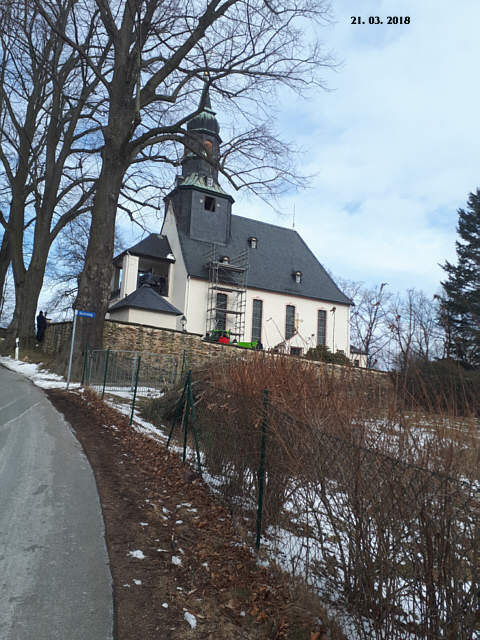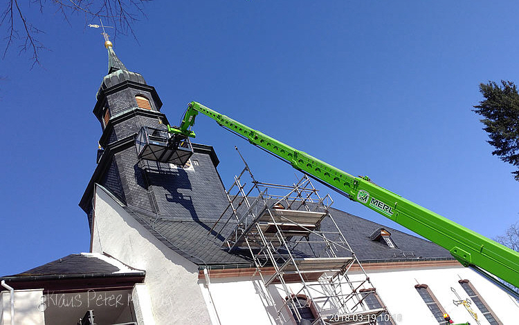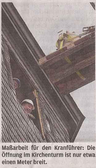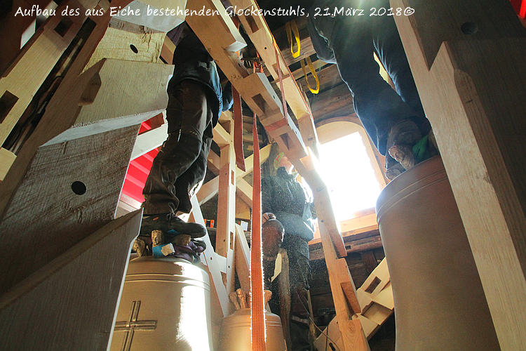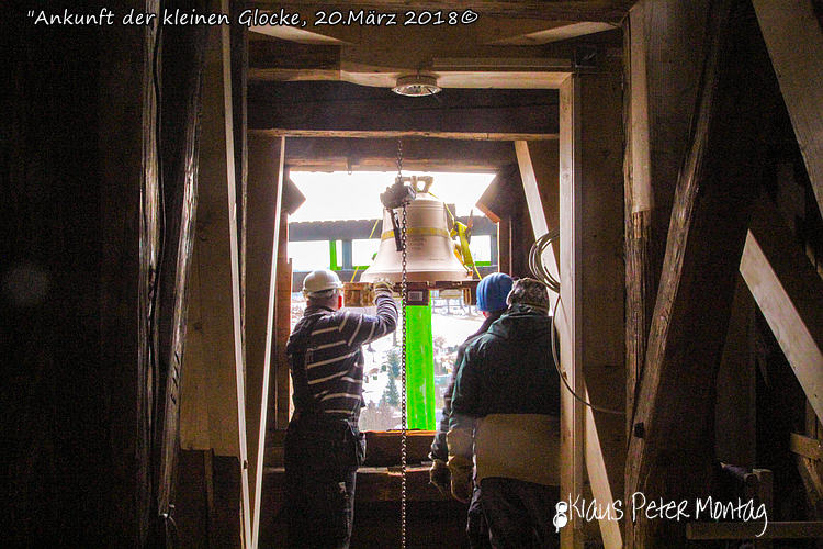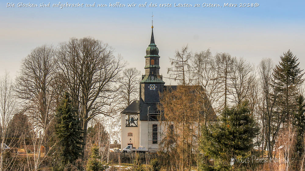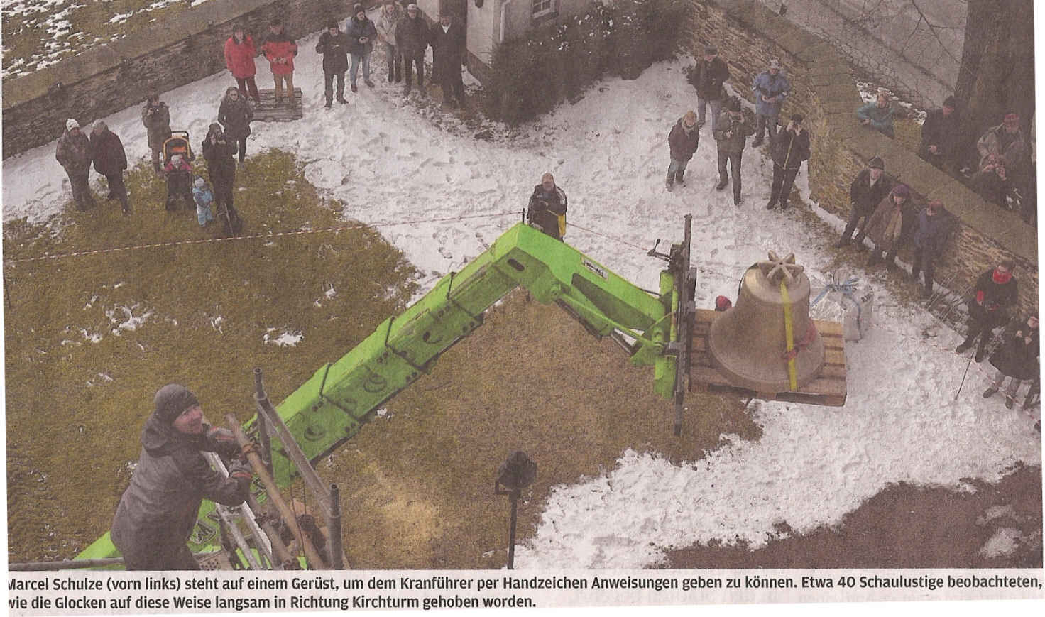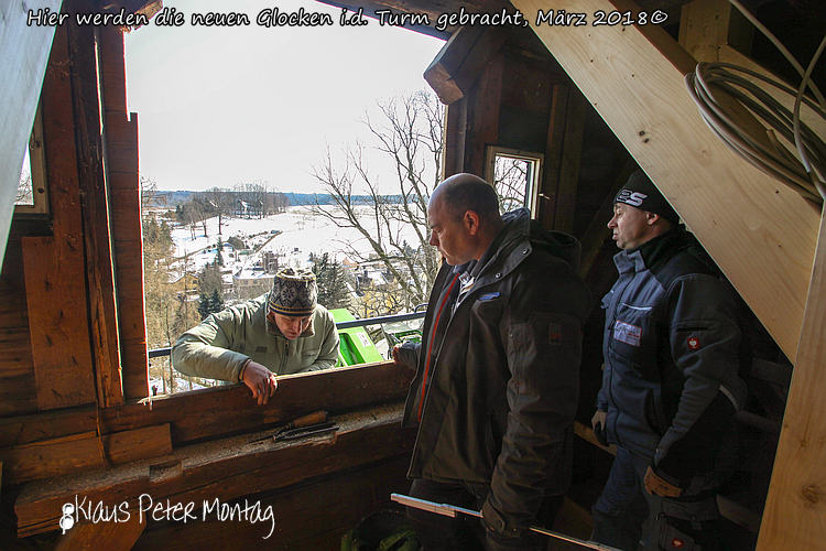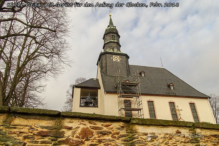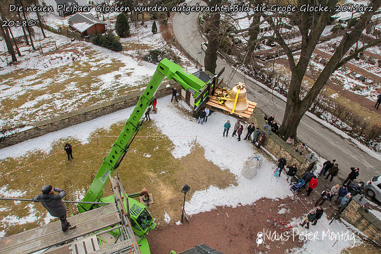 Der Weg der Glocken hinauf in den Turm Das neue Geläut der Pleißaer Kirche ist an seinem Bestimmungsort angekommen. Der Kranführer erlebte dabei eine Schrecksekunde. -VON JOHANNES PÖHLANDT (TEXT) UND ANDREAS SEIDEL (FOTOS)- PLEIßA - Die wohl schwierigste Aufgabe an diesem frostigen Dienstag hat Jens Adam. Der Unternehmer aus Langenchursdorf montiert normalerweise Türen, Fenster und Rollläden, manchmal mithilfe eines Krans. Glocken fielen bislang nicht in sein Zuständigkeitsgebiet Er sei aufgeregt, räumt Adam ein. Ich habe so etwas noch nie gemacht. Und dann ist die erste Glocke auch noch die schwerste." 540 Kilogramm sind es, um genau zu sein. So viel bringt die größte der drei Bronzeglocken auf die Waage, die gestern in den Turm der Pleißaer Kirche befördert wurden -mithilfe von Adams Kran. Etwa 15 Meter sind es vom Erdboden bis zu einem Loch im Kirchturm, das erst für die Prozedur entstanden ist; sonst hat dort das Zifferblatt der Kirchuhr seinen Platz. Wir mussten außer der Uhr noch zwei Reihen der Schieferplatten herausnehmen, sonst wäre die Öffnung zu klein gewesen", berichtet Steffen Schulze. Der stellvertretende Vorsitzende des Kirchenvorstands hat zuvor jede Glocke einzeln per Spanngurt auf einer Palette befestigt. Adam schiebt den Kranarm unter die Palette und hebt die Glocke an. Erst gewinnt sie schnell an Höhe, dann immer langsamer. Je dichter das wertvolle Gut dem Kirchturm kommt, desto komplizierter wird es. Denn die Öffnung im Turm ist nur etwa 1,50 Meter hoch und einen Meter breit. Adam muss sich beim Manövrieren fast vollständig auf Zurufe verlassen. Wegen des Gerüsts sehe ich fast nichts", erklärt er. Auf dem Gerüst, das neben der Kirchenfassade errichtet wurde, steht Marcel Schulze und gibt Handzeichen, die Adam interpretieren muss. Den Kran noch ein Stück nach oben, jetzt einige Zentimeter nach rechts. Meist funktioniert die Kommunikation, nur einmal nicht: Die Palette setzt kurz auf dem Rand der Öffnung im Turm auf, ein lautes Knarzen und aufgeregte Schreie sind die Folge. Doch. Adam korrigiert seinen Fehler schnell, der Kirchturm bleibt heil. Ich hatte am Anfang Schwierigkeiten, die Handzeichen richtig zu verstehen", wird der Kranführer hinterher lachend sagen. Nachdem er die Glocke in das Loch im Turm gehoben hat, sind Ralf Stiebitz und Sven Hirche an der Reihe. Die beiden Mitarbeiter einer Firma aus Heidenau bei Dresden, die sich auf den Einbau von Kirchenglocken spezialisiert hat, lösen die Spanngurte und befestigen stattdessen einen Flaschenzug. Dazu steigen sie auf die Palette und vollführen ihre Handgriffe direkt neben der Öffnung im Turm. Einen Blick für die schöne Aussicht haben die beiden ebenso wenig wie Höhenangst. Die Pleißaer Kirche ist ja ohnehin eher niedrig", stellt Stiebitz fest. In Berlin habe er schon auf einem 60 Meter hohen Kirchturm gestanden. Nach einer halben Stunde setzen Stiebitz und Hirche die erste Glocke im Kirchturm ab. Als die zweite langsam vom Kran angehoben wird, guckt Johann Friedrich erneut gespannt zu. Er ist einer von etwa 40 Schaulustigen, die von der Wiese neben der Kirche aus den Kopf in die Höhe recken. Der Beobachter ist ein Glockenfan: Er hat mehrere Miniatur-Exemplare zu Hause, die er gern zum Klingen bringt, und guckt regelmäßig Videos über das Glockengießen an. Doch über seine Leidenschaft mit Fremden reden will er nicht: Johann ist erst zweieinhalb und schüchtern. Deshalb spricht seine Mutter Antonia Friedrich für ihn: Seit er in Mittelbach einmal ein lautes Glockenläuten erlebte, ist er fasziniert davon." Vater Garsten Friedrich filmt unterdessen pausenlos - damit der Sohn bei den Videos künftig mehr Auswahl hat. Auch viele andere Schaulustige haben Kameras mitgebracht. Mika Herold nicht. Der Pfarrer genießt den Augenblick. Lange hat er darauf gewartet, dass die neuen Bronzeglocken, die im vergangenen Sommer in Innsbruck gegossen worden waren, zum ersten Mal zu hören sind. Nun muss sich Herold, der das Geläut Ende Oktober 2017 bei einem Gottesdienst geweiht hat, nicht mehr lange gedulden: Am Ostersonntag gegen 7 Uhr soll es so weit sein. Eine Stunde wird es dann das volle Geläut geben, wie es bei hohen christlichen Feiertagen üblich ist", kündigt der Pfarrer an und lacht. Viele Pleißaer werden also von den neuen Glocken geweckt werden -und den Unterschied merken, ist Herold überzeugt. Die Bronzeglocken haben einen viel volleren Klang." Die bisherigen Stahlglocken aus den 1960er-Jahren haben ihre beste Zeit hinter sich und mussten schon mehrfach repariert werden. Sie werden ab Ostern nicht mehr gebraucht, sollen aber vorerst an ihrem Platz im Kirchenanbau bleiben. Bis das neue Geläut funktionstüchtig ist, sind noch einige Arbeitsschritte nötig. In den nächsten Tagen errichtet eine Firma einen Glockenstuhl aus Eichenholz. Das Holz ist stabil, da geht kein Wurm rein", erklärt Stiebitz. Er und sein Kollege Hirche sind anschließend wieder gefordert: Drei bis vier Tage wird es dauern, bis sie die Glocken fachgerecht aufgehängt und mit Elektrik versehen haben, damit ein automatisches Läuten möglich ist. Als gestern nach anderthalb Stunden alle drei Glocken unfallfrei im Kirchturm angekommen sind, fällt Steffen Schulze ein Stein vom Herzen. Wäre eine Glocke zu Schaden gekommen, hätten wir sie nicht schnell ersetzen können. So etwas dauert ein halbes Jahr." Als Jens Adam aus dem Führerhaus des Krans steigt, ist auch aus seinem Gesicht die Anspannung gewichen. Dass er die schwierigste Aufgabe des Tages mit Bravour gemeistert hat, belohnen die Schaulustigen mit Applaus. Quelle: Freie Presse" vom 21.03.2018 NEUE GLOCKEN : Mängel am Kirchturm entdeckt PLEIßA - Im Zuge der Anschaffung von neuen Glocken für die Pleißaer Kirche sind Mängel am Kirchturm festgestellt worden. Damit das Bauwerk die Last des Geläuts überhaupt aufnehmen kann, wurden seit vergangenem Oktober zusätzliche Holzbalken eingezogen. Dabei wurden Schäden entdeckt, weshalb die Arbeiten länger