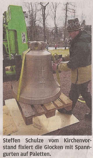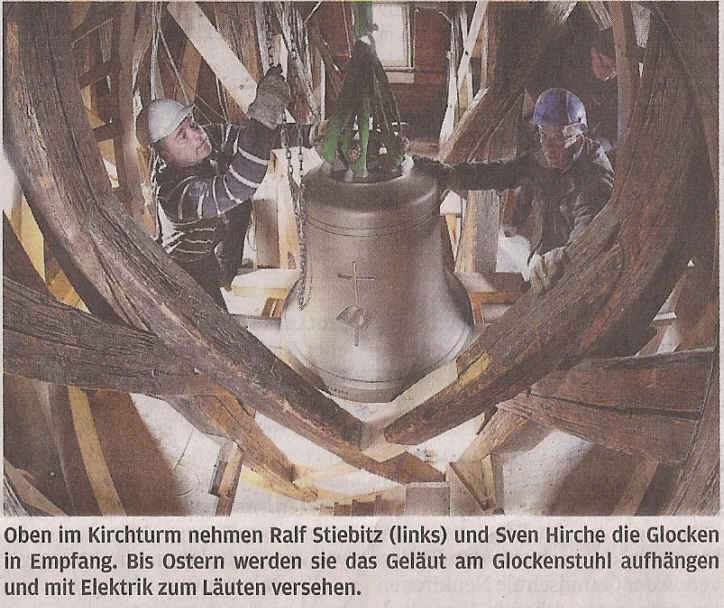 Neue Pleißaer Glocken gehen wieder auf Reisen Seit vergangenem Herbst befindet sich das Geläut in der Kirche, aber noch nicht am richtigen Ort. Nächste Woche soll sich das ändern. -VON JOHANNES PÖHLANDT- PLElßA - Die neuen Glocken für die Pleißaer Kirche haben schon zwei Reisen hinter sich. Zunächst traten sie den Weg von Innsbruck in Tirol, wo sie gegossen worden waren, nach Sachsen an - unscheinbar auf einem Lastwagen. Am Reformationstag 2017 hatten sie dann ihren großen Auftritt: Die zweite Fahrt führte die 205, 270 und 540 Kilogramm schweren Bronzeglocken quer durch Pleißa. Das Geläut war dafür mit Blumen geschmückt und gut sichtbar auf zwei Pferdewagen platziert worden. Nach dem Ende des feierlichen Umzugs wurde es in die Kirche bugsiert, an provisorischen Holzgestellen im Altarraum aufgehängt und bei einem Gottesdienst geweiht. Am Dienstag der nächsten Woche steht nun die dritte Reise an. Der Weg ist nicht weit, aber trotzdem anspruchsvoll, da er nach oben führt: Die Glocken werden in den Kirchturm gehoben. Das außergewöhnliche Schauspiel soll gegen 9 Uhr losgehen und etwa zwei Stunden dauern. Ein so großes Publikum wie am Reformationstag ist nicht zu erwarten. Mit einigen Schaulustigen rechnet Steffen Schulze aber schon. Wir haben den Termin bekannt gegeben. Wer kommen will, kann kommen", sagt der stellvertretende Chef des Kirchenvorstandes, der die Anschaffung der neuen Glocken organisiert. Anders als im Herbst muss Schulze am Dienstag nicht selbst anpacken. Den Transport des Geläuts per Kran in den Turm übernimmt eine Firma, die sich auf die Installation von Glockenanlagen spezialisiert hat. Das Unternehmen aus Heidenau bei Dresden ist auch für die weiteren Schritte an den folgenden Tagen verantwortlich: Mitarbeiter werden den Glockenstuhl in Einzelteilen in den Turm befördern, ihn dort zusammenbauen und schließlich das Geläut fachgerecht befestigen. Am Ostersonntag werden die Glocken dann zum ersten Mal zu hören sein", kündigt Schulze an. Bis es so weit ist, müssen er und seine Mitstreiter noch an einer kniffligen Aufgabe tüfteln: Durch welche Öffnung kommen die Glocken in den Turm? Expertise ist rar, denn die jetzigen Glocken, klanglich minderwertige Stahl-Exemplare aus den1960er-Jahren, traten nie den Weg nach oben an - sie sind in einem an die Kirche angedockten Anbau untergebracht. Schulze hat trotzdem schon eine Idee: Wir nehmen das Uhrenblatt heraus und hoffen, dass die Öffnung groß genug ist." Quelle: Freie Presse" vom 16. März 2018 |