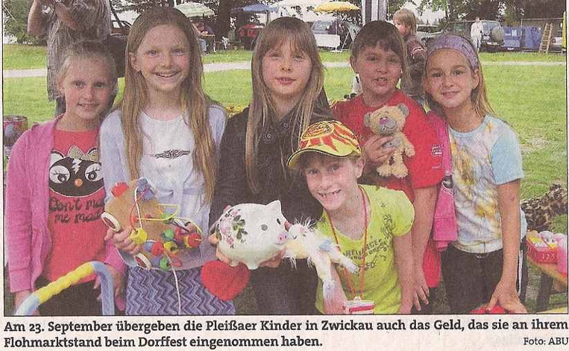 Schüler der Grundschule Pleißa spenden Erlös aus Lauf-Veranstaltung und Flohmarkt SOS-Kinderdorf freut sich über 2500 Euro Pleißa. (ABU). Die Anfänge liegen schon ein gutes Jahr zurück: Damals haben wir ein Musical einstudiert", erinnerte sich Lehrerin Margit Magirius. Mit meiner damaligen 4. Klasse haben wir beim Auftritt mehr Geld eingenommen, als wir je erhofft hatten." Nun stand die Frage: Was tun wir damit? Die Entscheidung fiel zugunsten des SOS-Kinderdorfs in Zwickau und des Limbacher Kinderheims: Beide teilten sich in den Betrag von 250 Euro. In diesem Jahr nahm Margit Magirius mit ihrer jetzigen 3. Klasse an der Aktion Kinder laufen für Kinder" teil: Die Schüler liefen auf unserem Sportplatz. Für jede geschaffte Runde zahlten Sponsoren" zwischen 10 Cent und 5 Euro." Die Lehrerin selbst war nicht mitgelaufen, konnte aber Firmen aus der Umgebung als Sponsoren" für den guten Zweck gewinnen: So haben z.B. die Rühlig-Bau Limbach und die GGG einen größeren Betrag zur Verfügung gestellt." Von der endgültigen Summe - 2573,90 Euro - konnte die Grundschule 10 Prozent behalten. Alles andere ging an die SOS-Kinderdörfer-Zentrale, die die Gelder nach Bedarf verteilt. Am 23. September fahren wir nun persönlich nach Zwickau," freute sich Lehrerin Magirius. Dann können unsere Kinder sehen, wohin ihr Geld geht und was damit gemacht wird." Die Pleißaer kommen nicht mit leeren Händen: Erneut gibt es 250 Euro als Geschenk" .Dafür hatten die Jungen und Mädchen beim Dorffest Kuchen verkauft und am Flohmarktstand Spielzeug angeboten. Quelle: Blick" vom 16. 09. 2009 Mehr : > http://www.schule-pleissa.de/ < |